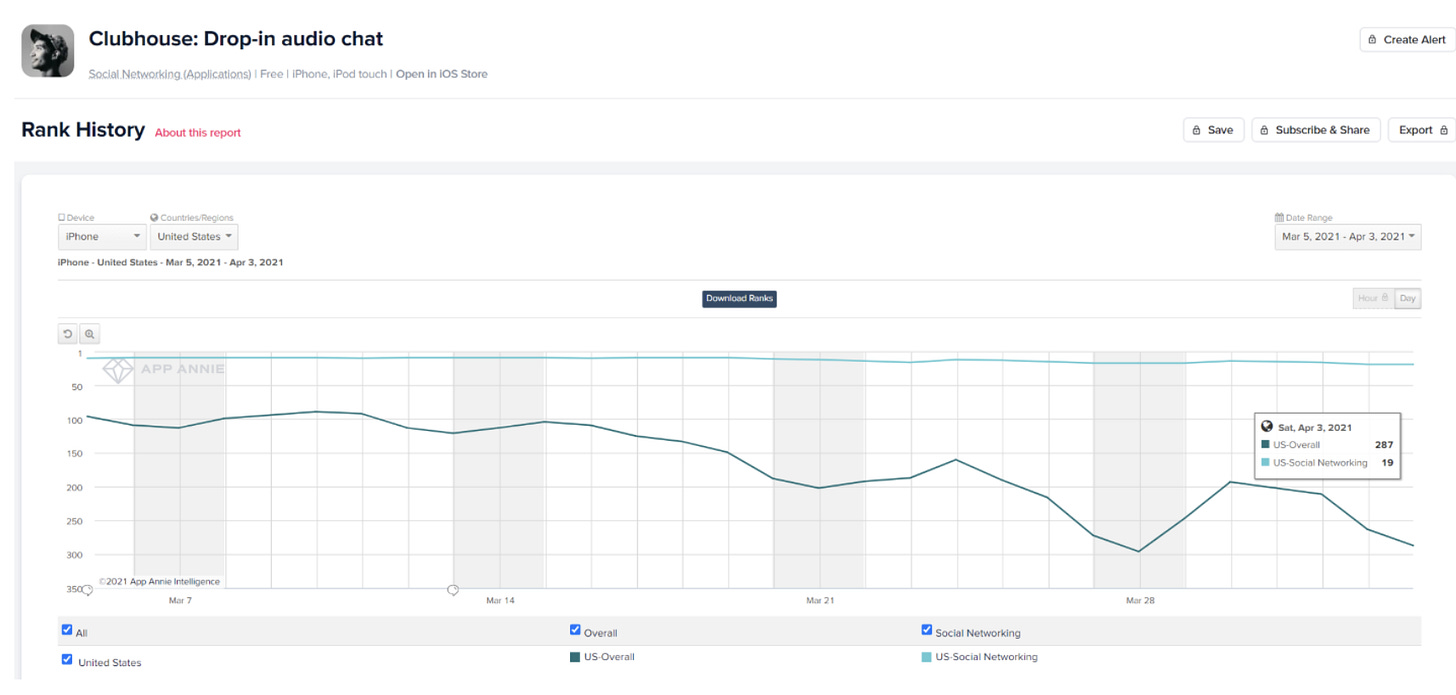 Since Shaan's viral tweet thread, Discord, Slack, Spotify, and LinkedIn have all announced live audio products. Meanwhile, FOMO on Clubhouse seems to be waning:
